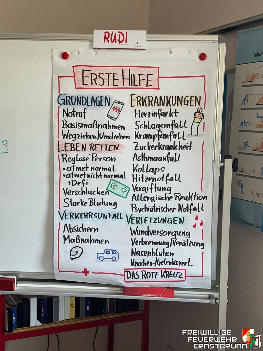 Organisiert wurde die Weiterbildung von unserem Sachbearbeiter Feuerwehrmedizinischerdienst, Leopold Kranz. Abgehalten wurde der Kurs vom Roten Kreuz. In insgesamt acht Stunden konnten unsere 14 Teilnehmerinnen und Teilnehmer ihr Wissen in der Ersten Hilfe auffrischen und vertiefen.