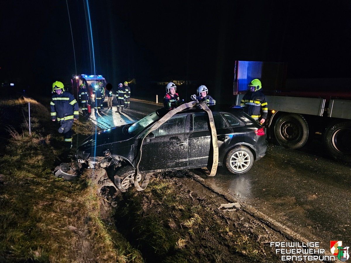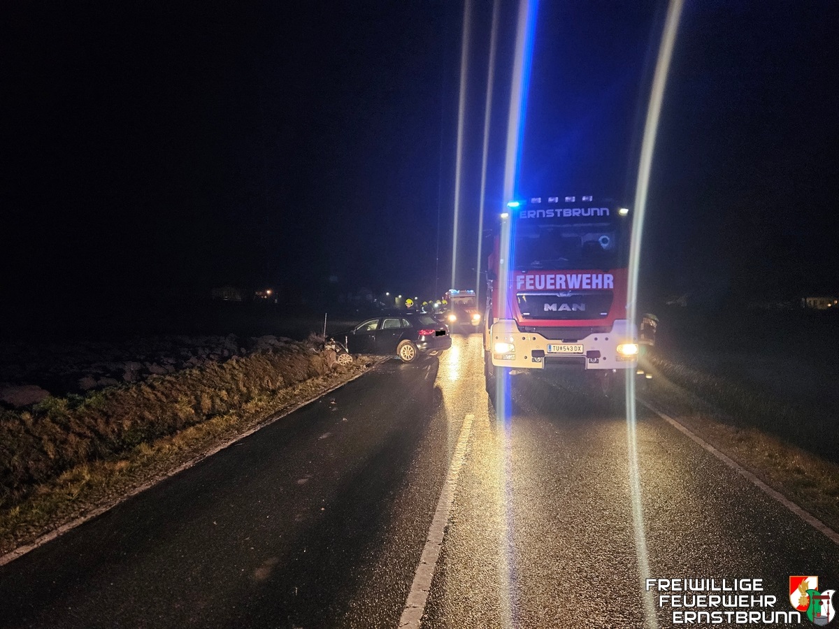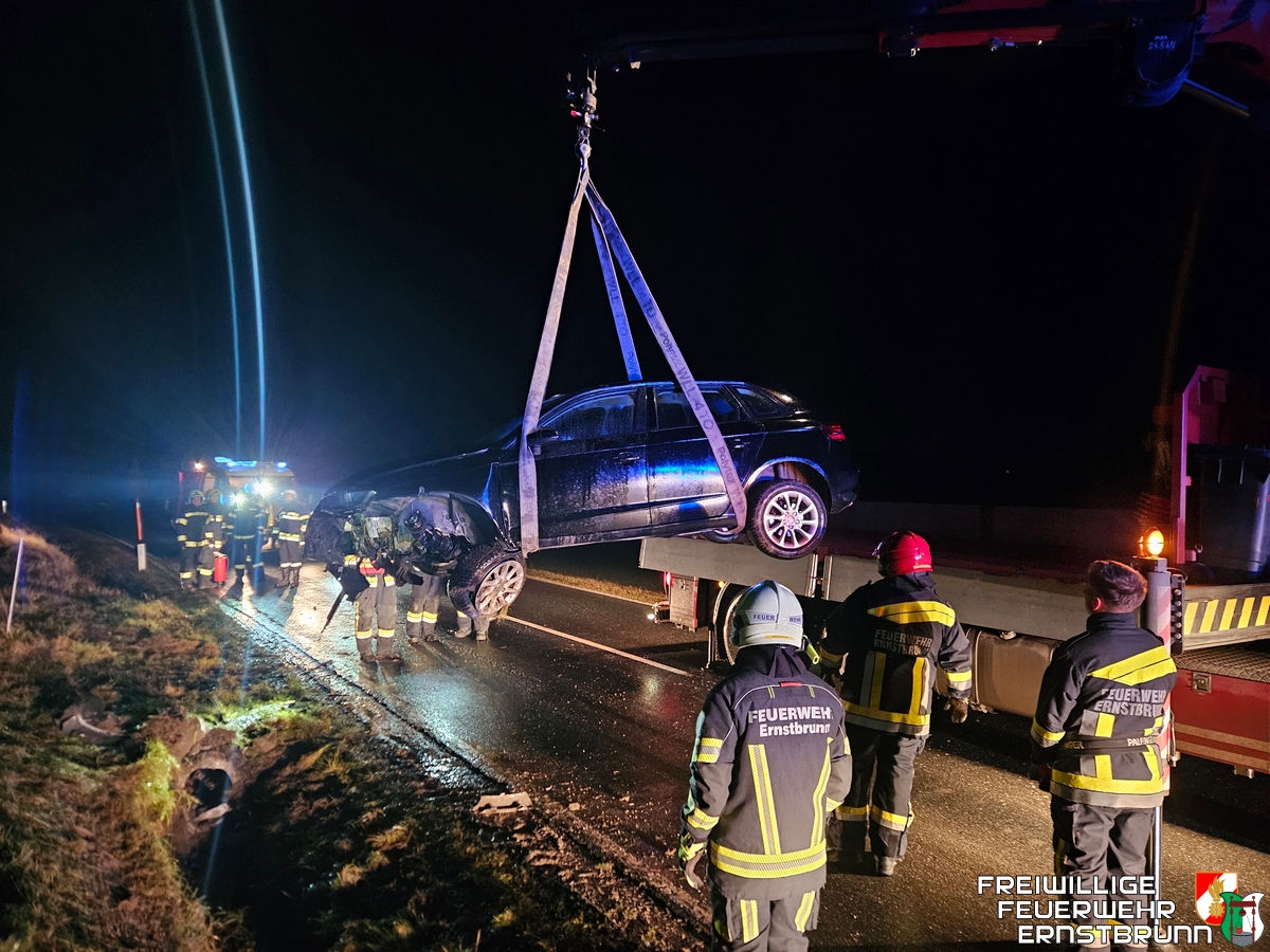 Ein Lenker war auf der regennassen Fahrbahn von der Straße abgekommen und gegen ein Betonrohr im Straßengraben geprallt. Beim Eintreffen war die Unfallstelle durch die Mitglieder der Freiwilligen Feuerwehr Naglern bereits abgesichert, sodass wir sofort mit der Bergung des beschädigten Fahrzeugs beginnen konnten.
